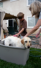 Last week, we also gave Orbit his first bath. The process included Furminator, dry Zoom Groom, and then wet Zoom Groom with shampoo. Elliot helped with the shampooing and the rinsing. He was a great help and he appeared to enjoy it. His favorite part is when Orbit shakes off all of the loose water. Now, we just have to figure out how to train Orbit to “shake” on command. Orbit did NOT like rinsing with the hose; he much prefers the bucket pour method.
